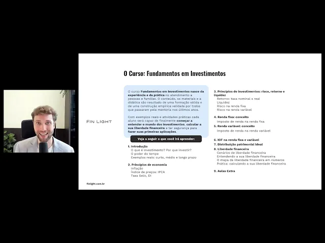 Esse curso é para você que quer começar a investir sem medo de errar. Ele é curto, direto e te ensina o essencial pra fazer suas aplicações com segurança — ou pelo menos entender o que um profissional te recomenda, sem só acatar tudo no escuro.